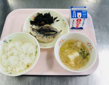 米飯 牛乳 鯵の干物 ひじきと大豆の炒め煮 豆腐と玉ねぎの味噌汁