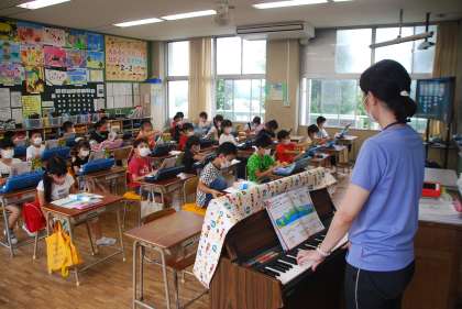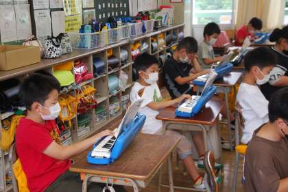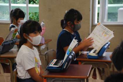 御覧のように音楽の授業ですが、鍵盤の運指のみで息を吹きかける行為は行っていません。何とか対応しながらできる限り学びをとめないよう努力しています。