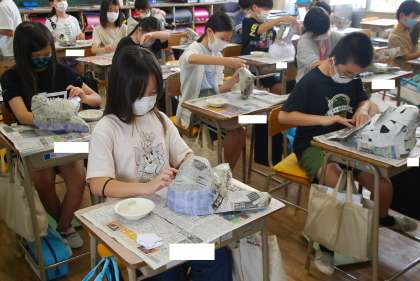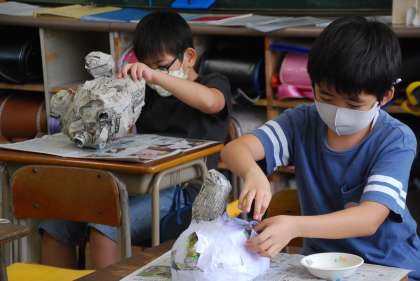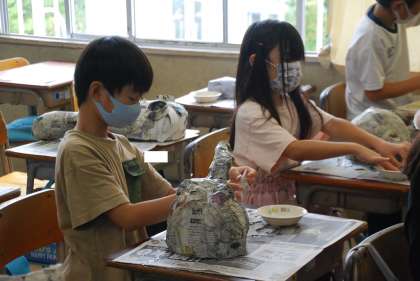 御覧のように図工の授業ですが、図工室は対面の座席となっており、飛沫のリスクが高まるので、教室で行うこととしています。教室であれば、飛沫のリスクはかなり下げられます。どの学級も画面には映っていませんが、対角線上の窓を常時開けて換気を徹底しています。