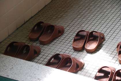 新型コロナウイルス感染症感染のリスクを減らすためとして、現在トイレのスリッパは床に置いたままにしています。従来は、スリッパを棚から床に置き、トイレから出る際には自分の履いたスリッパを棚に戻す流れでしたが、スリッパを手で持つ機会をなくすための対策です。子供たちには失礼ですが、かなり散らかったスリッパを想像していたのですが、そのような情景はほとんど見られず、かなり高い確率で写真のように整とんされています。子供たちの行い同様、御家庭での躾に感謝いたします。子供たちを育むために、御家庭同様、努力していかなければと思いました。