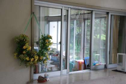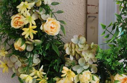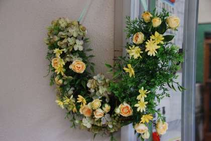 9月のアーティフィシャル・フラワーが事務室前に飾られました。ガーランドです。ガーランドとは、花や植物、果実を使ったひも状の装飾品のことだそうで、もともとは名誉のしるしとして贈られた花輪・花冠を意味しているそうです。花や植物に限らず、旗や飾りのついたひも状の装飾品全般のことのようです。