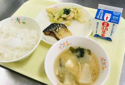 ・米飯 ・牛乳 ・焼き塩鯖 ・キャベツのごま和え ・豆腐とわかめの味噌汁