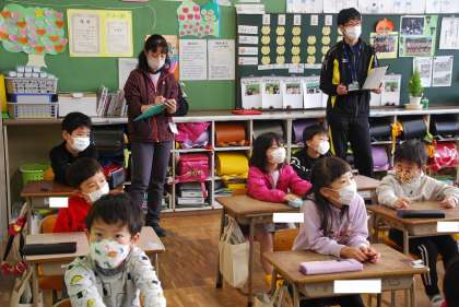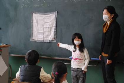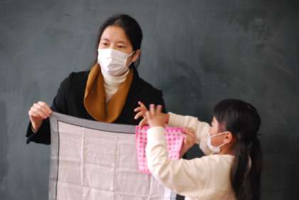 今日の授業の目標は、「ハンカチの広さを直接比較したり、ノートや教科書で間接に比較したりすることによって、どちらが広いか比べることで、長さ比べやかさ比べの学習の経験を生かして、広さ比べの方法を考えようとする」でした。子供たちは、グループで対話するときに、色々と試しながら、そして対話しながら課題に取り組んでいました。「う〜ん」と考え込んでいる声や「あっ、そうか」などの感嘆の声など聞くことができ、学びが深まっているようでした。