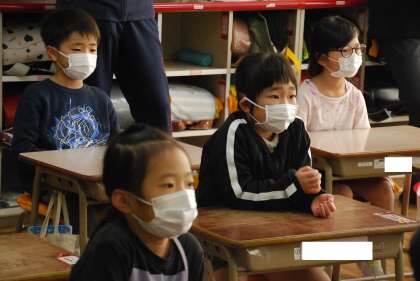 第2時間目は、1年1組国語の授業でした。目標は「順序が分かる言葉や時間の経過を表す言葉に注目したり、植物栽培の経験を思い返したりして、豆が育つ順序を考えることができる」でした。全員に配られた教材用のカードを前に、どの子も一生懸命順番を考えていました。