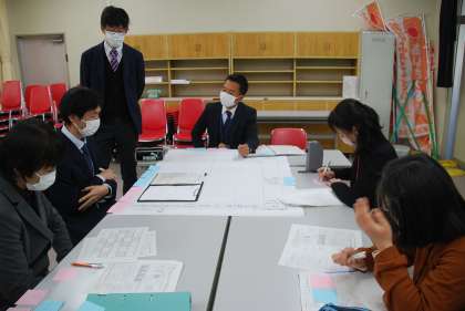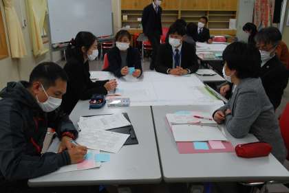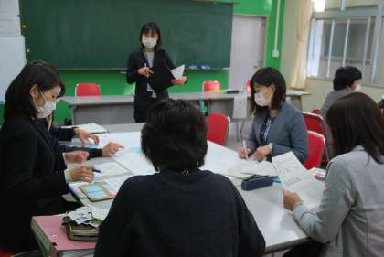 放課後、全教員で事後研修を行いました。授業参観した後、その授業についての勉強会の様なものですが、言うなれば教員の授業のようなものです。教員たちは子供たちに負けないようにと一生懸命意見を発表したり、対話をしたりしていました。発表のときには、しっかりと聴いている教員の方を向き、示し棒で示しながら発表していました。