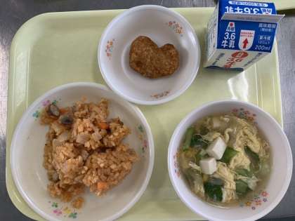 ・チキンライス ・牛乳 ・ポテトとお米のササミカツ ・中華卵スープ