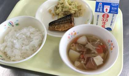 ・米飯 ・牛乳 ・鯖みりん干し ・キャベツのごま和え ・のっぺい汁