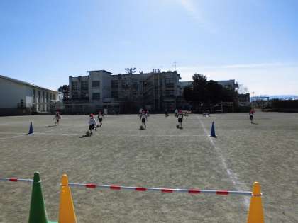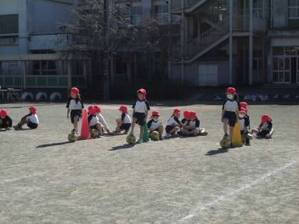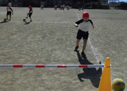 ボール蹴りをしています。遠く離れたゴールまで、ドリブルをしながら近づいてシュートをしました。