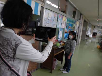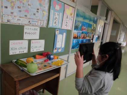 すきなものを廊下の立体掲示で紹介している場面です。自分の学びを画像で残し,自分の姿を画像に残してもらうことで,家に帰ってからも家族と学習を振り返ることができます。日本語学習を通して,母語の力も豊かにしていくねらいがあります。