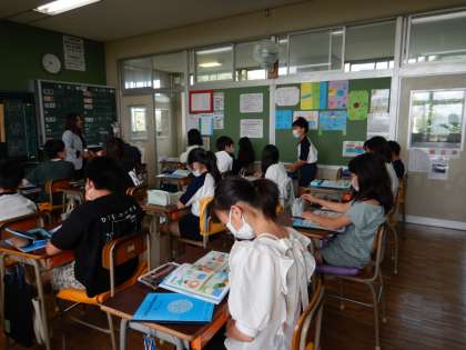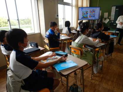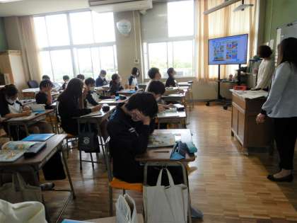 さまざまな場面の英語の音声を聞いて、どの絵の場面なのか考えました。