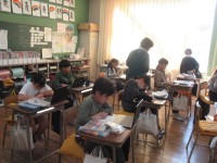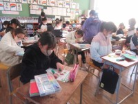 外部講師による「楽器を吹く友達」の絵も、いよいよ仕上げとなります。今日は、背景の描き込み方や塗り方を教えていただきました。