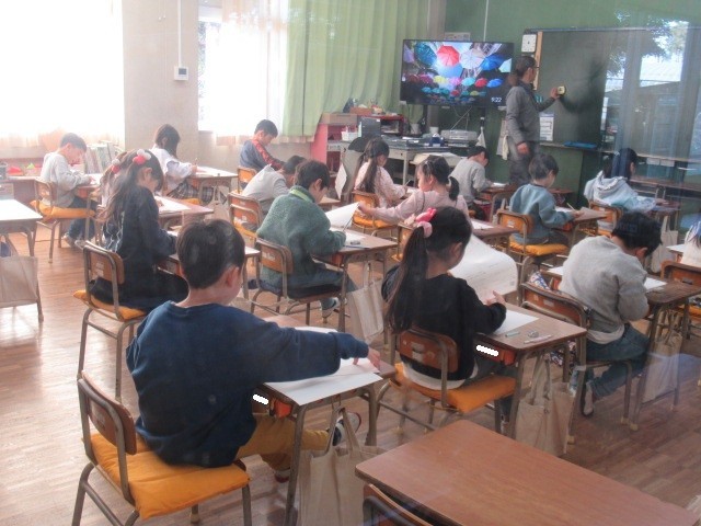 4年生の教室からの発信を、子供たちは、各教室で、オンラインでお話を聞きました。