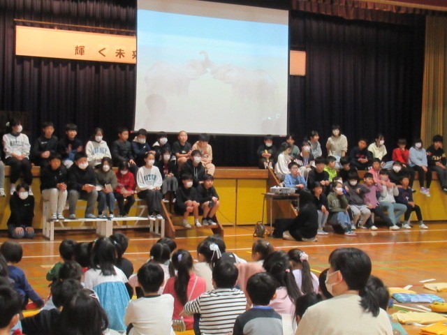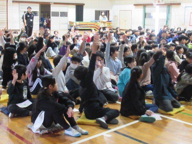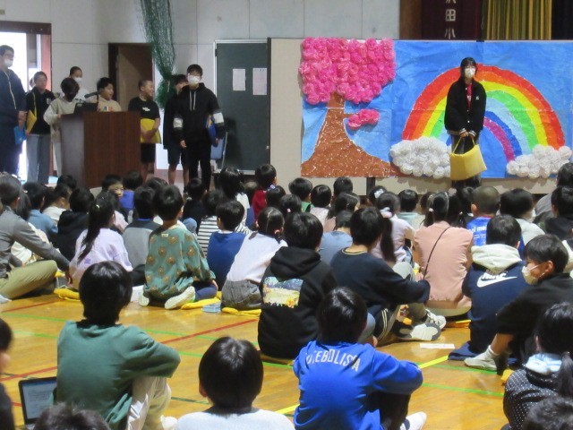 パート1は、体育館に全校が集合して、集会形式の全体会をしました。