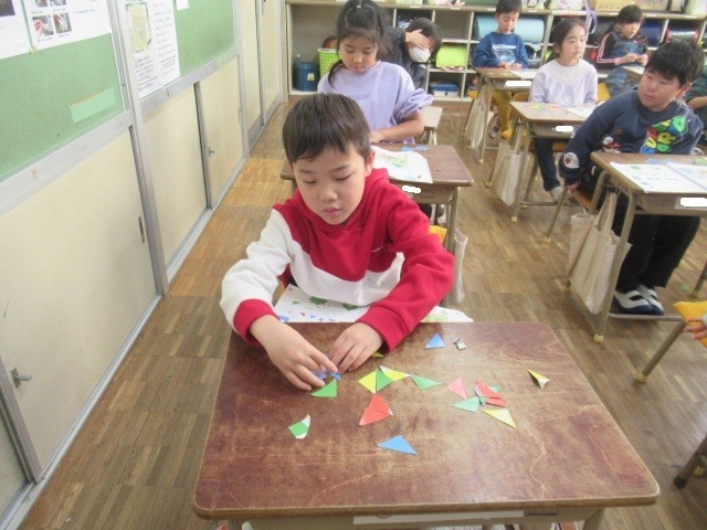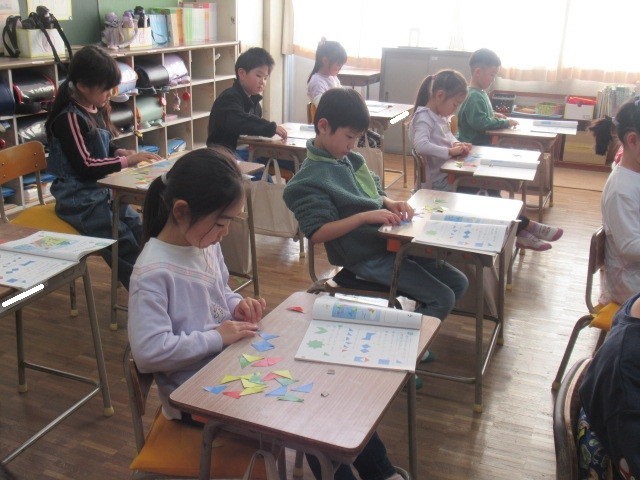 いろいろな形の色板を組み合わせて、教科書と一緒の形を作ります。
