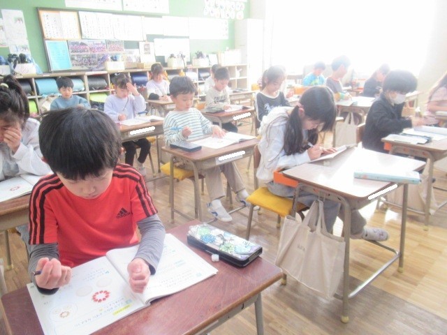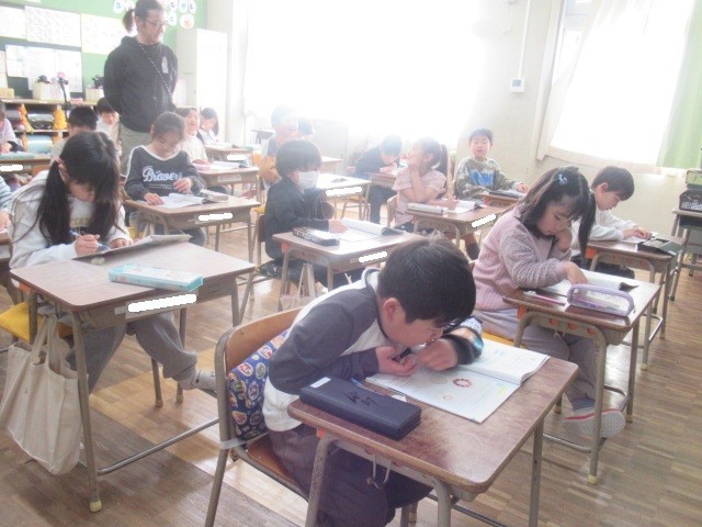 1年生の教室では、冬休み中にやった家庭学習を提出したり、算数の復習をしたりしていました。