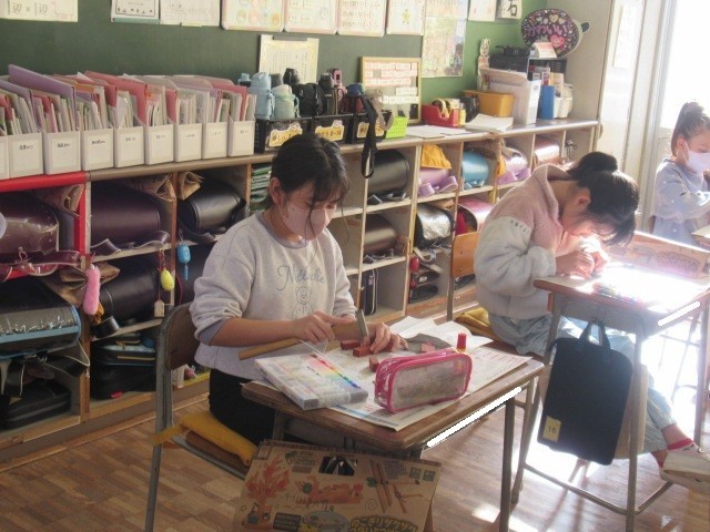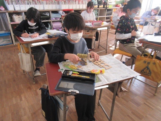 図工の「ギコギコトントン」では、のこぎりや金づちを使って作品を作っていました。