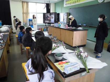 静岡県農芸振興課で行っている「フラワーアレンジメント制作体験講座」を2年生で行いました。3校時は1組が体験しました。講師の先生に教わりながら、静岡県産の花を使った素敵なアレンジメントを作りました。