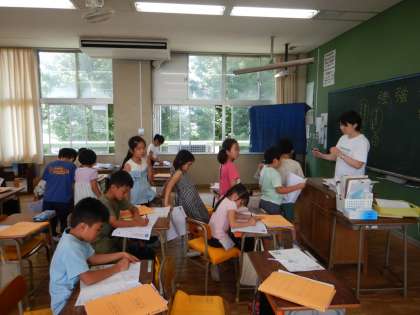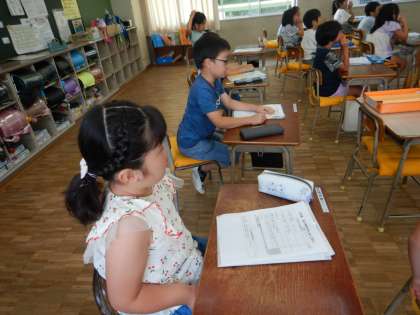まずは、代表児童の6年生が、1学期がんばったことを全校児童の前で堂々と発表しました。校長からは、「命を守る」大切さをはじめ、「挨拶を進んでする」「めあてを決めて努力する」の3つの約束について、1学期の生活をもとにふり返る話がありました。校歌を歌って会が終了した後、生徒指導主任から、夏休み中の生活について「な・つ・や・す・み」を合い言葉とした話がありました。 -