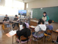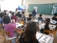 4年生が、10年後の自分たちのまちを想像し、絵を描いていました。様々な絵の具の技法を使って、きれいなしゃぼん玉を絵にのせるようです。