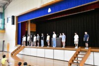 今日も自然教室のグループごと並び、リーダー中心にしっかりと座って待っていました。進行係の司会や挨拶も素晴らしかったです。天候が少し心配ですが、そんな心配を吹き飛ばすような4,5年生のチームワークでした。