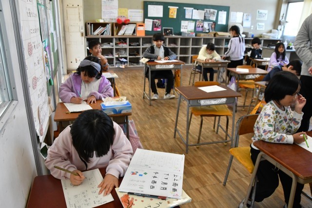 書写の授業です。お清書シートに、一字一字ていねいに書いていました。