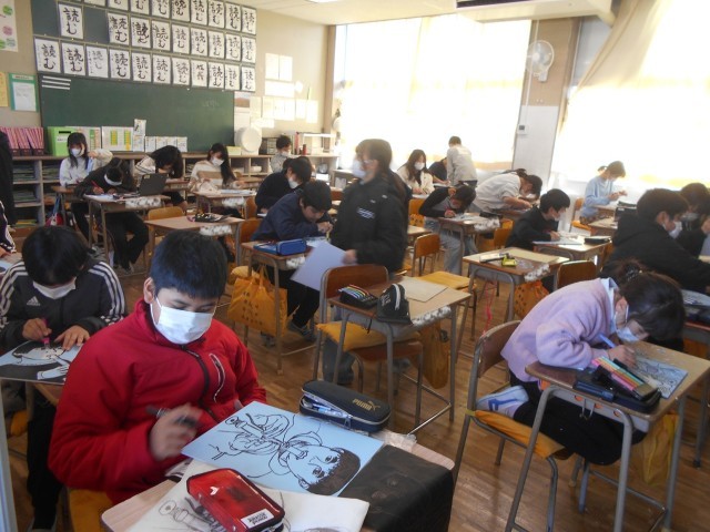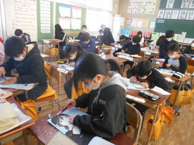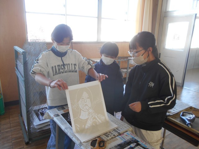 木版画に取り組んでいます。顔の膨らみによって彫り方を変えたり細かいところも丁寧に彫れたりしています。