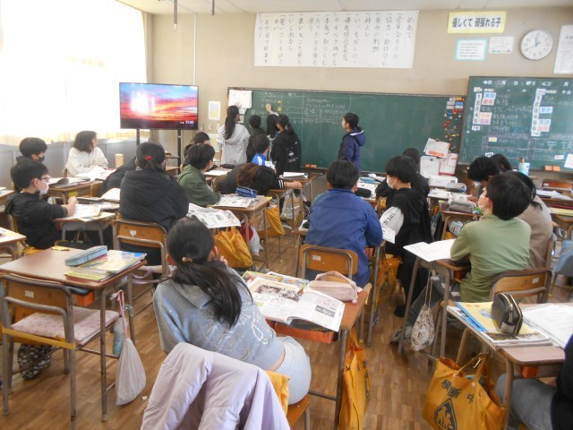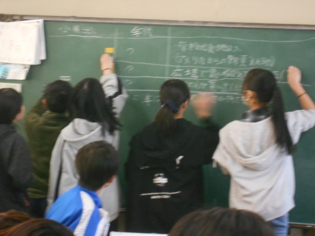 戦後の人々の生活について学習していました。司会や板書は子供たちが行い、資料集から読み取ったことを発表し合い自分たちで授業を進めていました。