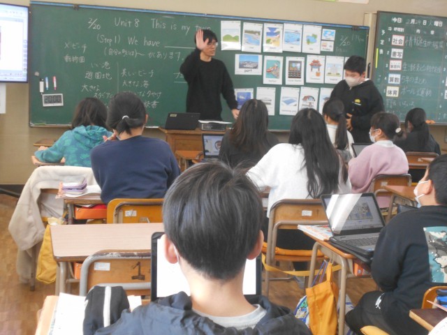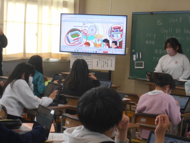 町でどんなことができるか、紹介する文章を聞いて、どの町かを答える学習をしていました。デジタル教科書を使っています。