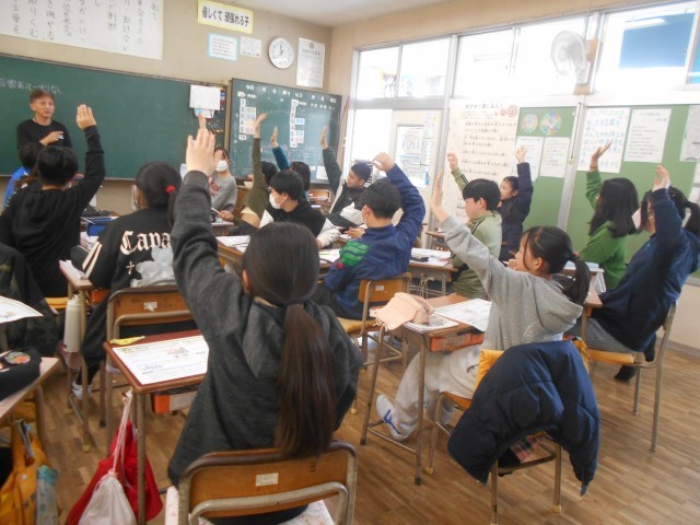 体育(保健)の授業で、「喫煙の害」について学習していました。たくさん手が挙がっていてびっくり!子供たちの関心の高さがうかがえます。現在は喫煙禁止になっている場所の中で、過去には喫煙が認められていた場所はどこだろう?という質問でした。