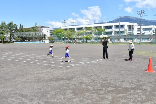 天気がよく、1年生は気持ちよさそうに運動していました。今日は、50メートル走のタイムを計りました。