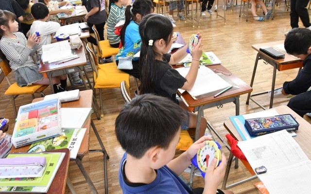 2年生は、時計の学習をしています。今日は大型モニターに映された時刻を見て、自分の時計を合わせていました。