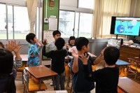 1年生が交通安全教室を行いました。交通安全指導員さんから、交通事故に遭わないために、目、耳を使って、頭で考えて歩くことを教えてもらいました。