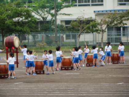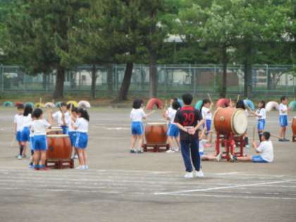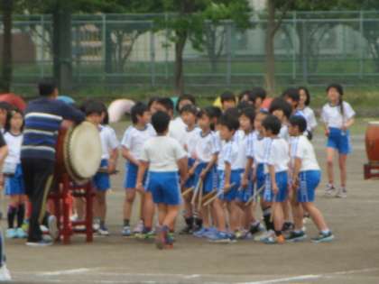 雁作太鼓の練習をしている4年生。今日から運動場に練習場所を変えました。
