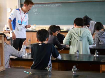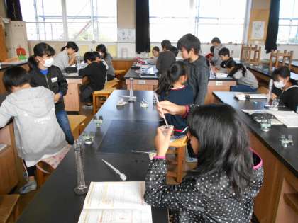 5年1組は理科の時間、メスシリンダーの使い方の学習です。