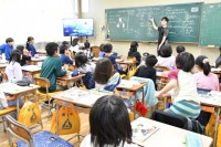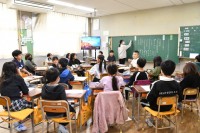 3年生です。学級委員長に立候補した人たちが、どんなクラスにしたいのか発表しています。聞いている人たちは、発表の後に温かい拍手を送っていました。これも「きれいな学校」の目指す姿ですね。