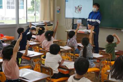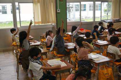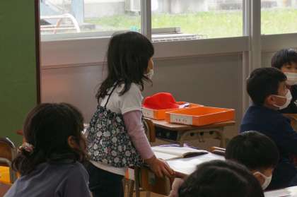 1年生は国語のひらがなの学習です。今日は、濁点のつく言葉を考えて発表していました。たくさん思いつくことがあるようで、元気いっぱい発表していました。