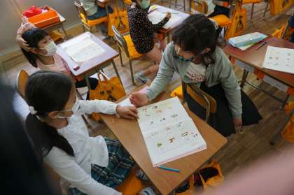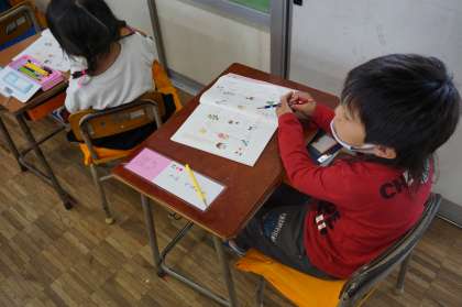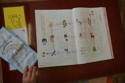 1年生は国語です。しりとりめいろをやっています。ゴールまでたどりつけるかな?