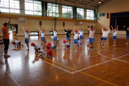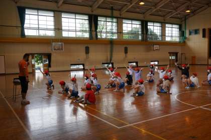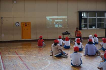 6年1組は体育です。組体操の練習に入りました。最初の場面の練習です。他のクラスが行ったものの映像を見て様子を確認します。かっこよくできるように頑張ってください。
