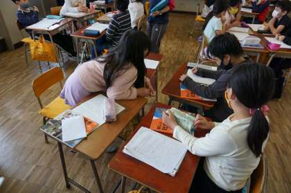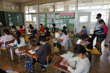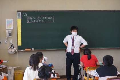 教職員研修センターの望月アドバイザーに来校していただき、2年目の藤井先生の研究授業を、4年1組で行いました。自然災害からくらしを守るという単元です。今日は地震に対して課程で備えているものを確認していきます。