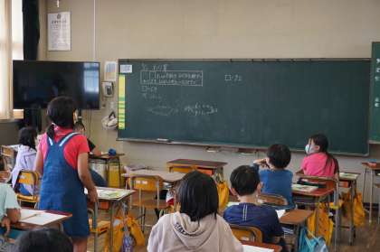 4年生は算数です。わり算に入っています。( )枚の色紙を3人で同じ数ずつ分け、一人が何枚かを考えていきます。69枚のときはすぐにできたのですが、72枚では、1の位が3で割り切れないので困っています。今日の課題が決まり、考えています。いろいろな考え方が出てきています。この後に発表していきます。