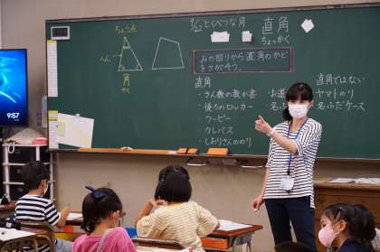 2年生算数の授業です。特別な角である直角について学んでいきます。身の回りにある直角を見つけていきます。