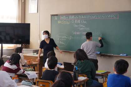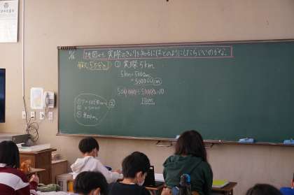 6年1組算数の授業です。地図から実際の距離を計算する方法を学んでいます。縮尺5万分の1で、5kmは何cmで表されるのでしょう。