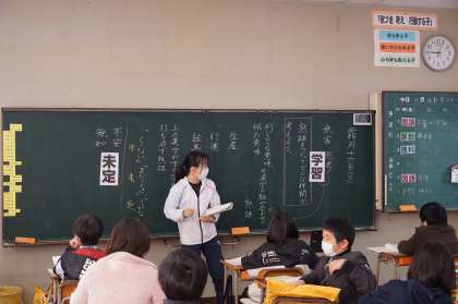 4年生国語の授業です。熟語をつくり、その仲間分けをしていきます。同じ意味どうしなのか、上が下を打ち消すものなのかなどを考えていきます。