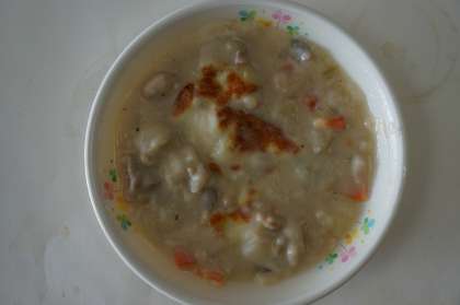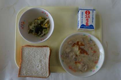 本日の献立は 食パン チキンポテトグラタン 海藻サラダです。チキンポテトグラタンはチーズの風味がよく、パンによく合いました。海藻サラダはさっぱりしていて、グラタンの口直しにもいいです。
