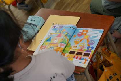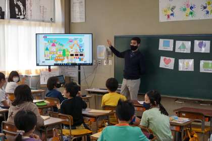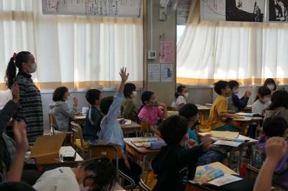 3年生英語の授業です。絵を見て、ALTの話した色や形と同じものを探していきます。
