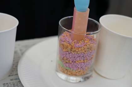 フラワーアレンジメントクラブです。色のついた粒を使ってグラデーションを作っていきます。とてもきれいですね。フラワーアレンジメントクラブは「チーム学校」実現事業の費用を使い、地域の方の支援を受けて行っています。