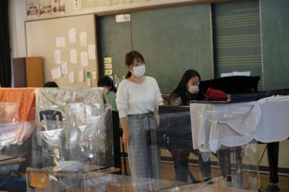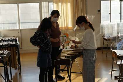 音楽クラブです。パプリカの合奏に向けて練習をしています。音楽クラブは「チーム学校」実現事業の費用を使い、地域の方の支援を受けて行っています。