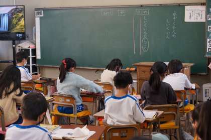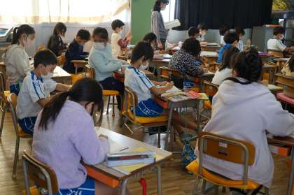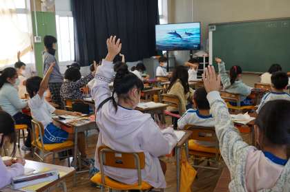 2年生国語の授業です。文章の組み立ての学習です。水族館の飼育員の仕事について、はじめ 中 おわり に分けていきます。