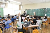 4年生体育の授業です。本日から始まったなわとび運動を体育でも行っています。カードに書かれている種目に取り組んでいます。