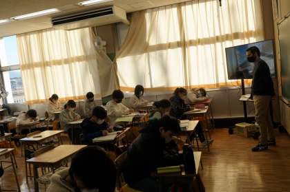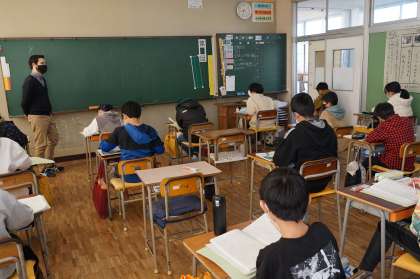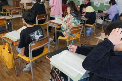 6年2組英語の授業です。単語のスペルを聞き取り、ノートに書いていきます。真剣に取り組んでいます。